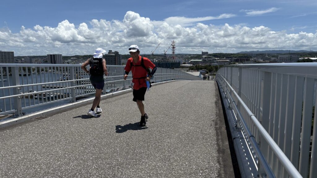 高さ27m、長さ236mという、“日本一高い歩道橋”である中の島大橋を渡らなければいけないのです。皆さん笑顔を見せてくれていますが、歩道橋は坂になるため苦行だったことでしょう。