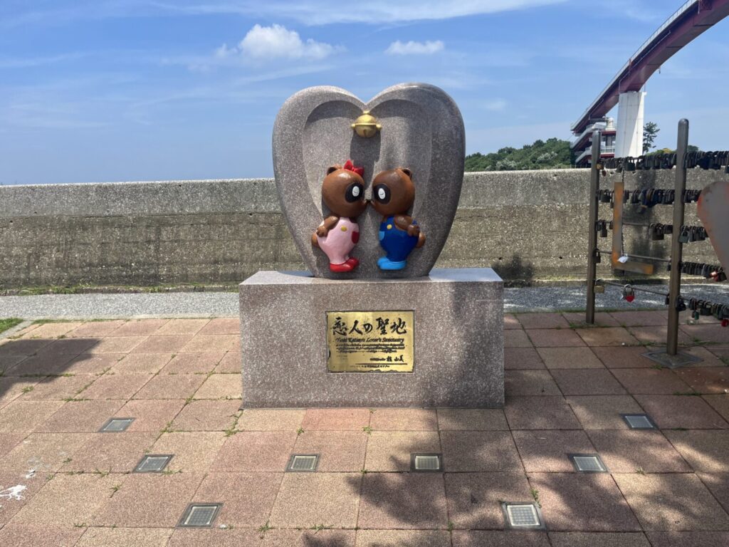 京葉工業地帯を通り、市原市から袖ケ浦市、そして木更津市へ。そこで待っているのが、第一チェックポイントの「恋人の聖地」です。可愛らしいタヌキの像があり、横には訪れたカップルが付けた近いの南京錠があります。