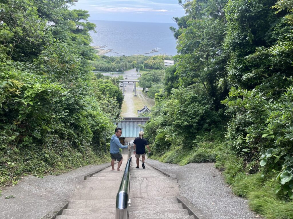 コース上で「ここ通るの!?」と驚くのが、館山市にある洲崎神社です。富津岬のように西へ飛び出していて景色は最高。ただ、この階段を上った先にある本殿がチェックポイントとなっています。階段は150段もあり、ここを駆け上がったランナーは…恐らくいないでしょう。高所恐怖症なら、目を瞑ってしまいたくなるくらいの急な階段。ただ、洲崎神社は源頼朝に縁があるとも言われており、館山に来たなら足を運んで見て頂きたいスポットの一つです。