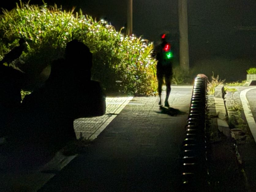 パクチー銀行を後に、さらに目指すは滝口エイド。房総半島最南端に当たる、野島埼灯台の近くです。周囲は暗闇に包まれ、ランナーは前後にライトを灯して進みます。走るペースによって夜間にどこを走るのかは違いますが、コース上は街灯の少ない場所が多いため安全対策は欠かせません。