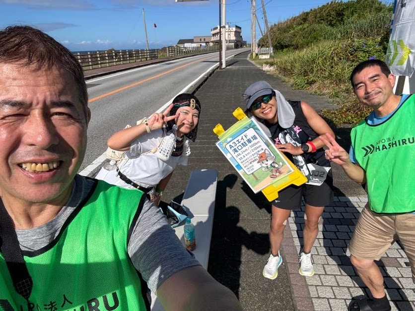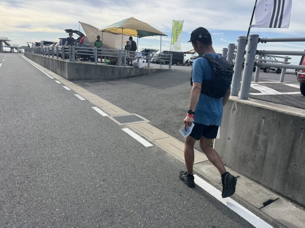 1日目の朝9時、元気にランナーがスタートしました。混雑を避けるため、1人ずつ順番で走り出していきます。本大会では7か所のエイドステーション(給水等が行える場所)があり、まずは46.7km先にある「富津岬」を目指します。いきなりフルマラソン以上の距離ですが、300kmから見れば短い…のかもしれません。