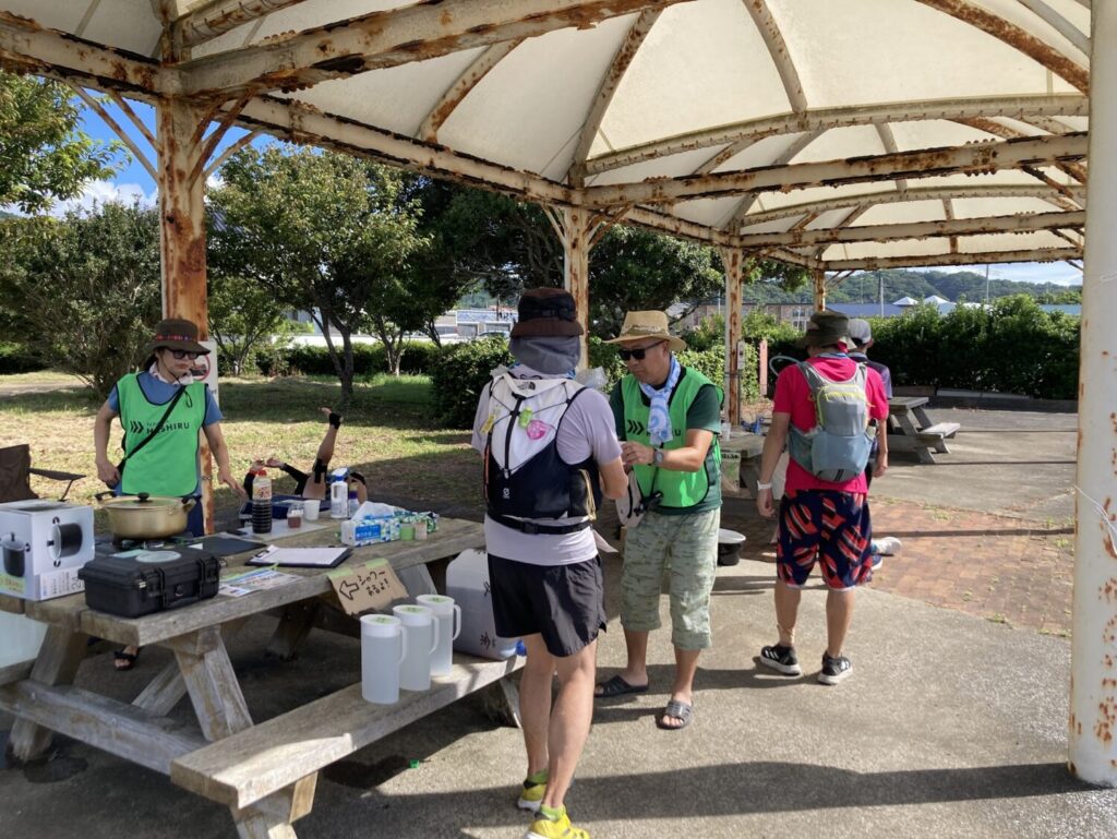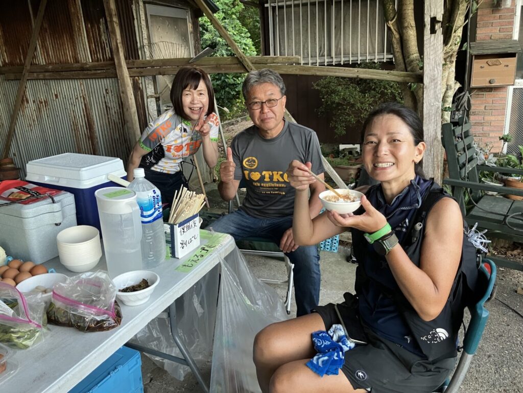 屋根はありますが、時間と共に日影の位置が変わるので大変。長時間エイドを開設してサポートしてくださるスタッフの皆さまには感謝しかありません。温かいものは温かく、冷たいものは冷たい状態で提供する工夫など、サポートあってこそ走り続けられたという選手も多かったでしょう。