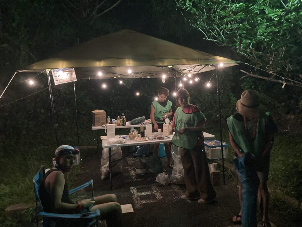 そして辿り着いたのが、約213.1km地点にある八幡岬公園のエイドステーション。周囲には街灯などなく、暗闇の中にテントの明かりが見えました。