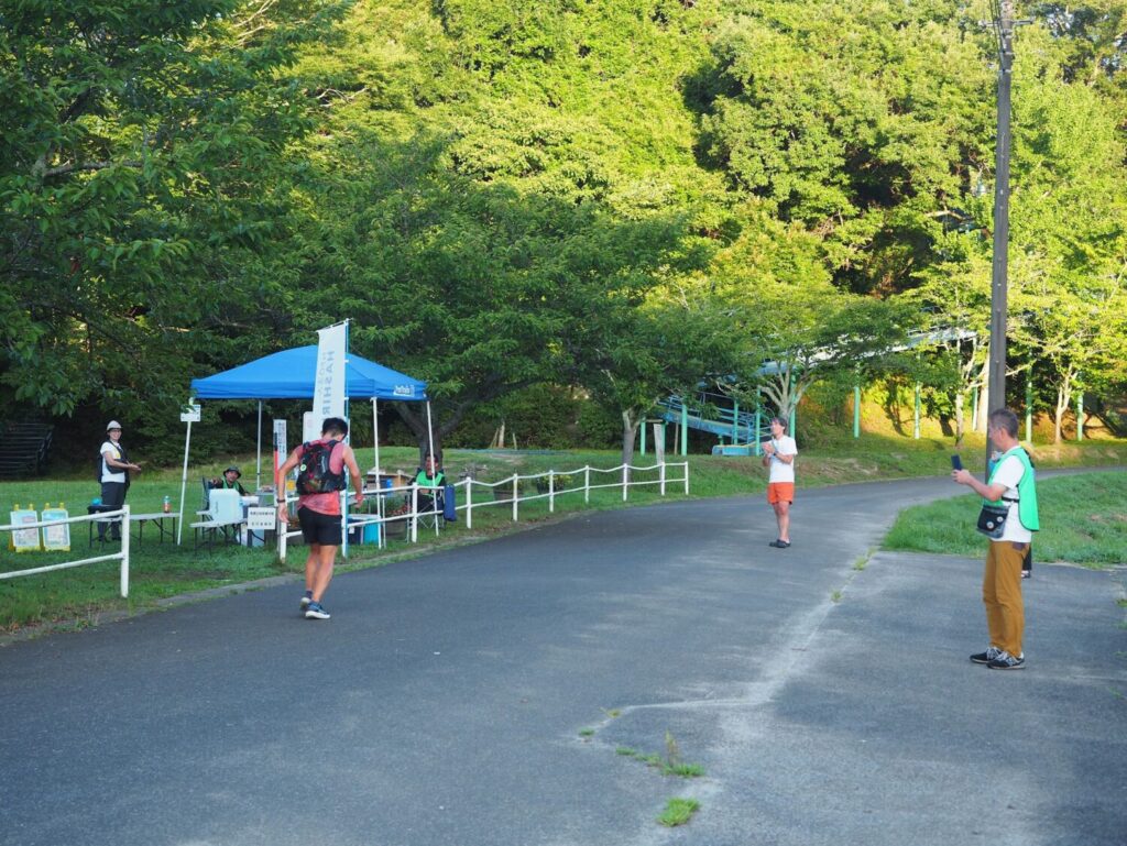 滝口駐車場から約25kmで、和田浦駅近くにある花の広場公園のエイドに到着。ここまでエイド間はそれぞれ40km前後の距離だったので、とても短く感じました。こちらでは水シャワーが用意されており、暑くなった体をクールダウンさせていく選手もチラホラ。また、ベンチとテーブルが快適なのか、長居される方も多かったようでした。