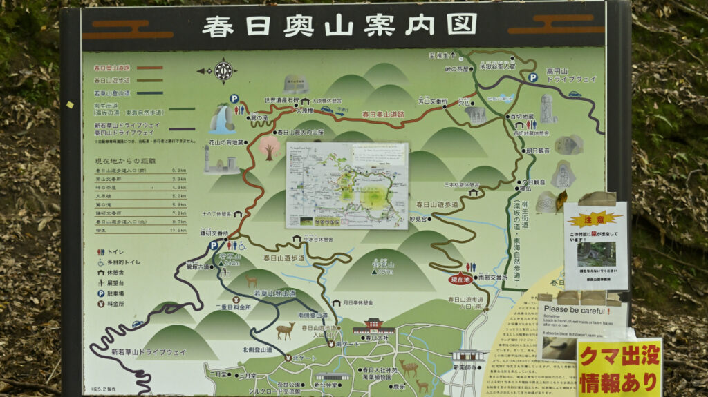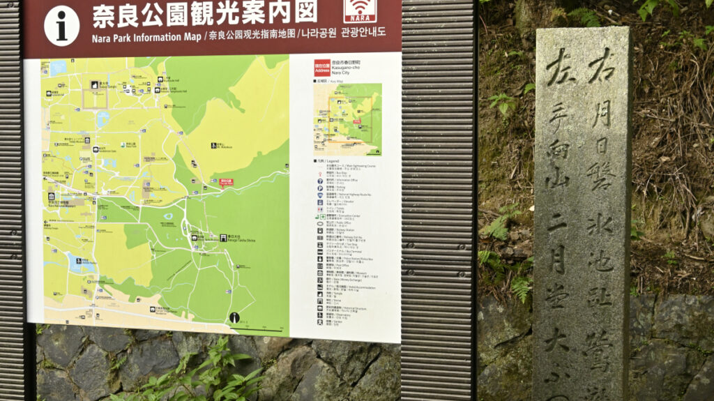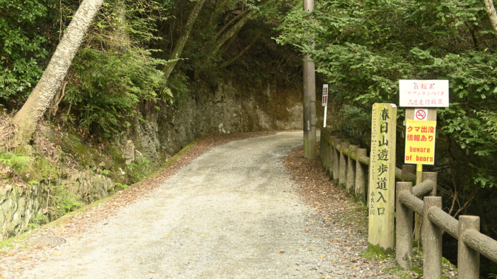 今回私が歩んだルートのスタート地点は、春日大社の南、高畑地区の南側にある春日山遊歩道入口です。東側の南部遊歩道を経て北上、北側に位置する春日山遊歩道入口へと戻る反時計回りの周遊ルートになります。この周遊ルートは、北側より南側へと時計回りに進むことも可能です。