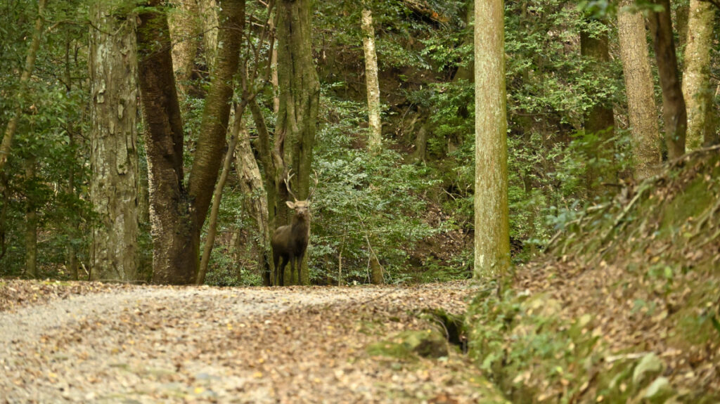 しかし、春日山原始林の奥にいるシカは、観光客に近づくことが少ないため、角きりの対象にはなりません。そのため、角が生えたままの雄ジカが生息しています。奈良公園のシカと違って野生のシカは警戒心が強く、距離を詰めようと少し動くと逃げていきました。