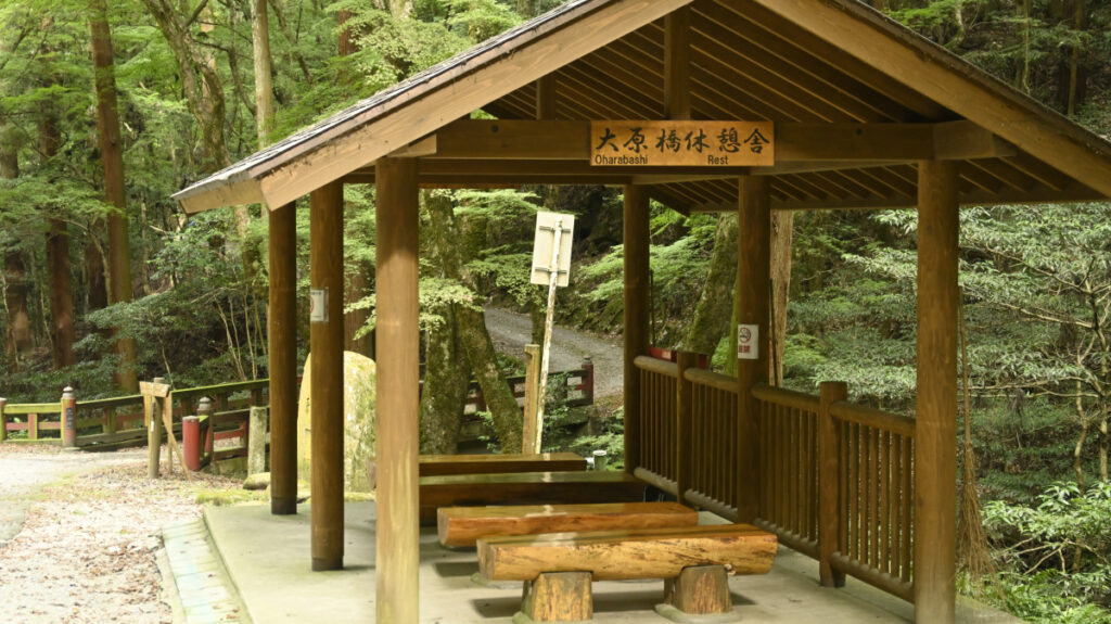 大原橋は、鶯の滝へと向かう遊歩道です。橋のすぐ下には小川が流れています。開けたスペースとなっており、開放感があります。橋の側には休憩舎も設置されており、息や足を休めるにはちょうど良いでしょう。
