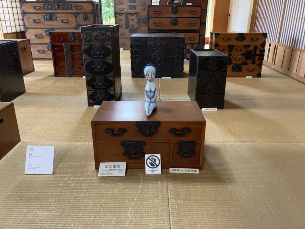 矢作川を眺めながら、季節の和菓子とお抹茶を楽しめる和室「勘桜亭」。歴史ある器でお茶を飲めるのも、民芸館ならではでしょう。入り口では佐々木類によるガラス作品が展示されていました。