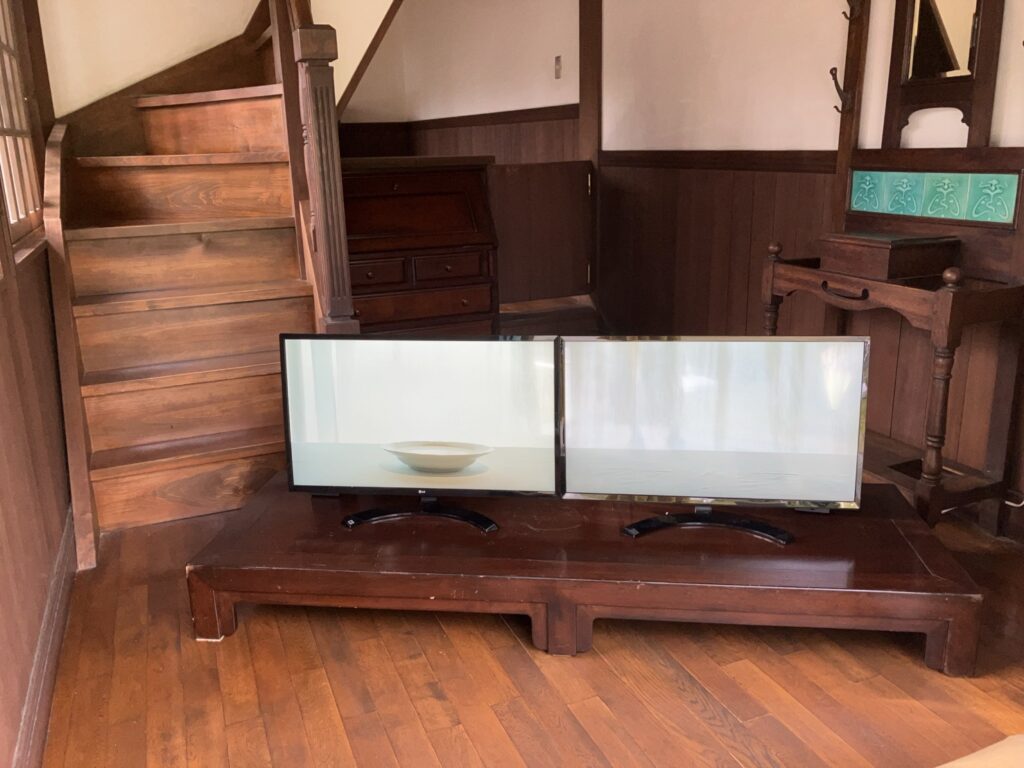 農場の迎賓館や住宅としても使用された旧井上家住宅西洋館。2000年には国の登録有形文化財にも登録されています。屋根瓦と西洋建築が融合する室内では、シルビア・リバスによる映像作品が展示されていました。