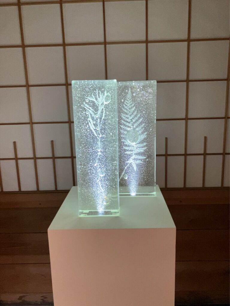 退色していく人々の記憶をガラスに閉じ込めた佐々木の作品。まばゆい光を放つ植物が、過ぎ去りし日の記憶を静かに甦らせます。儚さの中に、時の流れがかたちを変える瞬間。命を宿したような輝きに、過去と未来が静かに溶けあいます。
