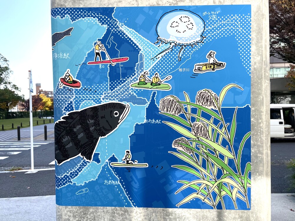 無機質なグレイの柱に色鮮やかな川のブルーと生き物たちが乗っかることで、周辺がパッと明るい印象に変わります。