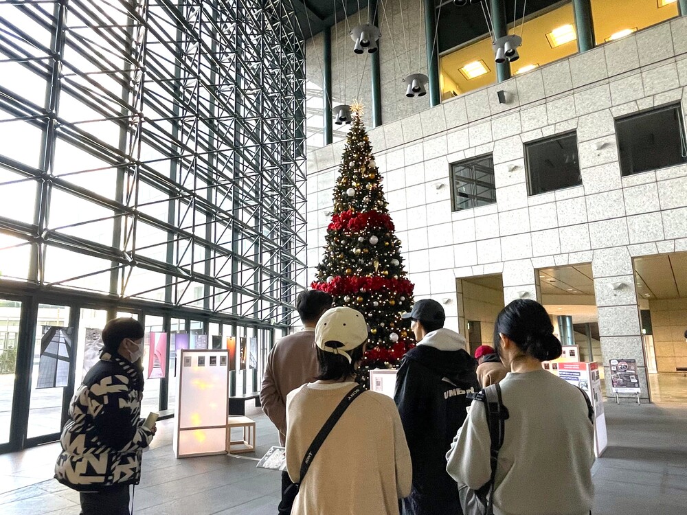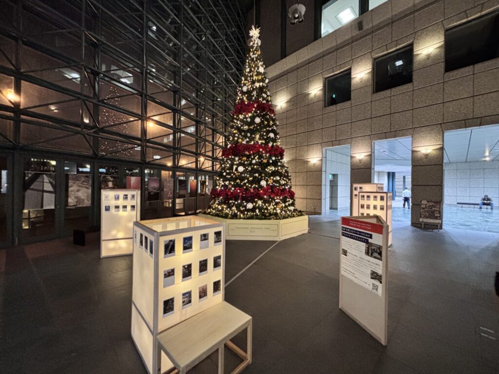 ビルのロビーに展示されているのは大きなクリスマス・ツリーと写真。こちらのクリスマス・ツリーは、昨年に続き「PILE」が中心となってディスプレイしたそう。
