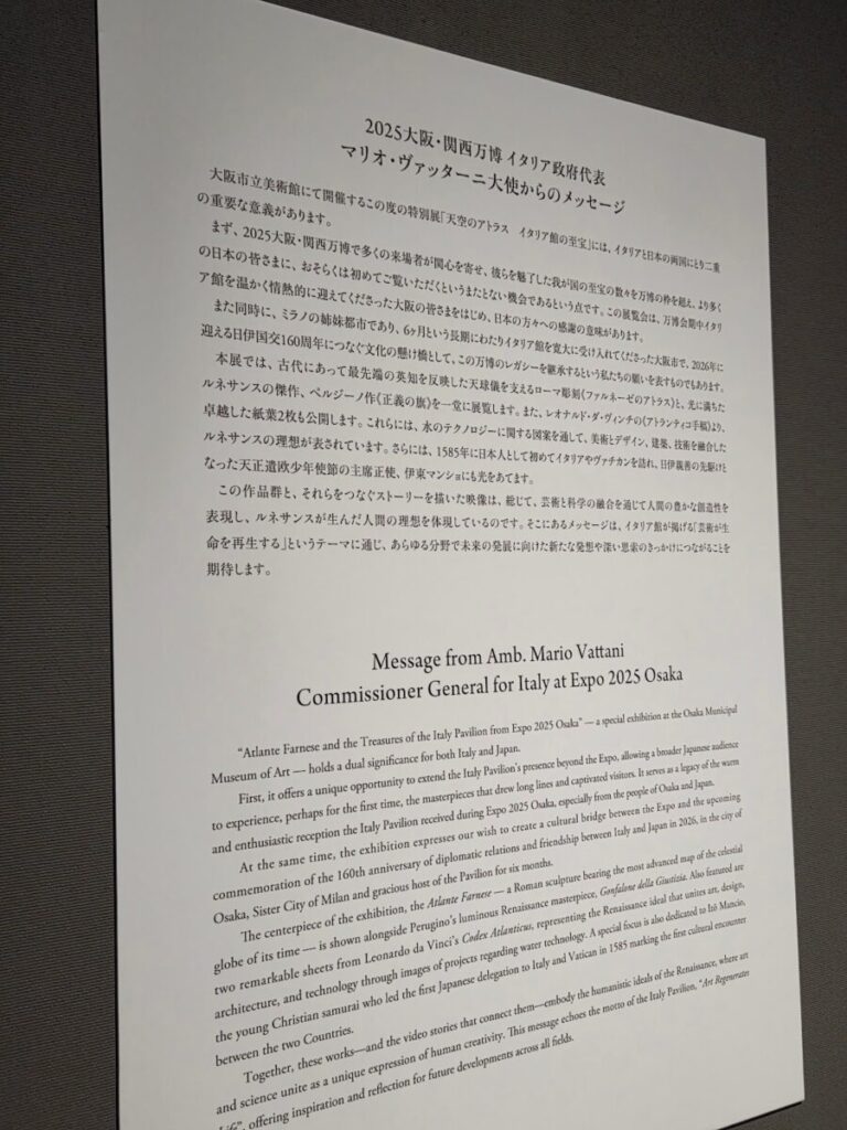 2026年は日本とイタリアは国交樹立160年の節目を迎えます。これを祝して、特別展が開催されました。イタリア政府代表のマリオ・ヴァッターニ大使は「この展覧会は、万博会期中、イタリア館を温かく情熱的に迎えてくださった大阪の皆さまをはじめ、日本の方々への感謝の意味があります」とコメントしています。