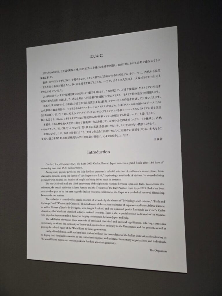 イタリア館の展示品の一部が、万博閉幕後に大阪市立美術館で公開されたのが、特別展《アトラスの至宝展》です。本展はすでに終了していますが、内容が非常に充実しており「見逃した人にも伝えたい!」と感動する展覧会でした。