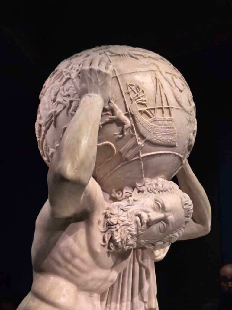 ギリシャ神話に登場する巨人アトラスが、オリュンポスの神々との戦いに敗れ、罰として天球儀を支えている姿が表現されています。ご覧ください。ほとんど白目を剥いているアトラスのしんどそうな顔を……。手の血管から筋肉の隆起までとってもリアルで精巧に作られていますね。