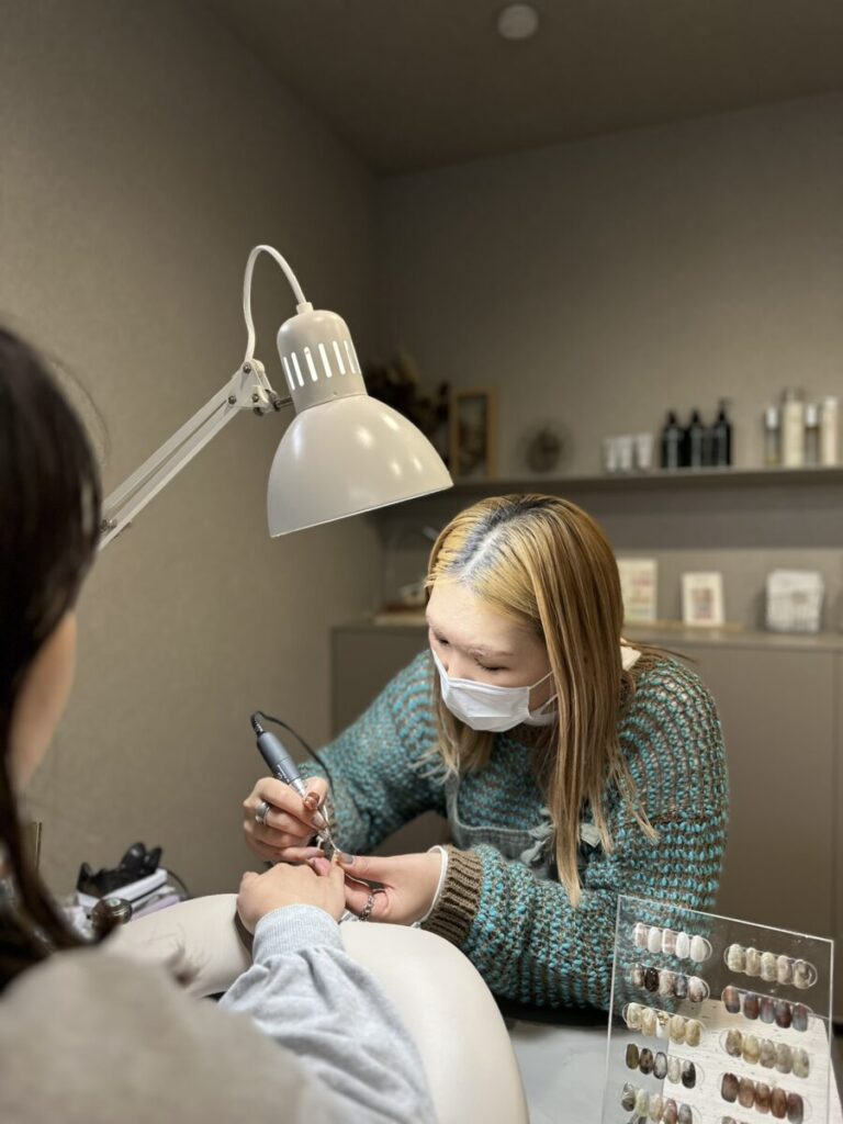 順風満帆なように見えるが、実はネイル検定に何度も落ちた過去があるとのこと。その度に心が折れそうになったが、練習に練習を重ねて何度も挑戦してきた。ネイルの先生にも「練習すれば、必ずできるようになるよ」と言われ、その言葉を信じて今も努力を重ねている。時間があればネイルの動画を見て、サンプルの作成等、日々自己研鑽をし、技術力の向上につなげている。ネイルは流行りにとても左右されるので、流行りのデザインの習得にも余念がない。とても大変そうに感じたのだが、それさえも「その時間が何よりも楽しくて」と吉田さん。努力を惜しまない吉田さんの姿勢に、私自身も心を打たれ、私も努力を重ねていきたいと思った。