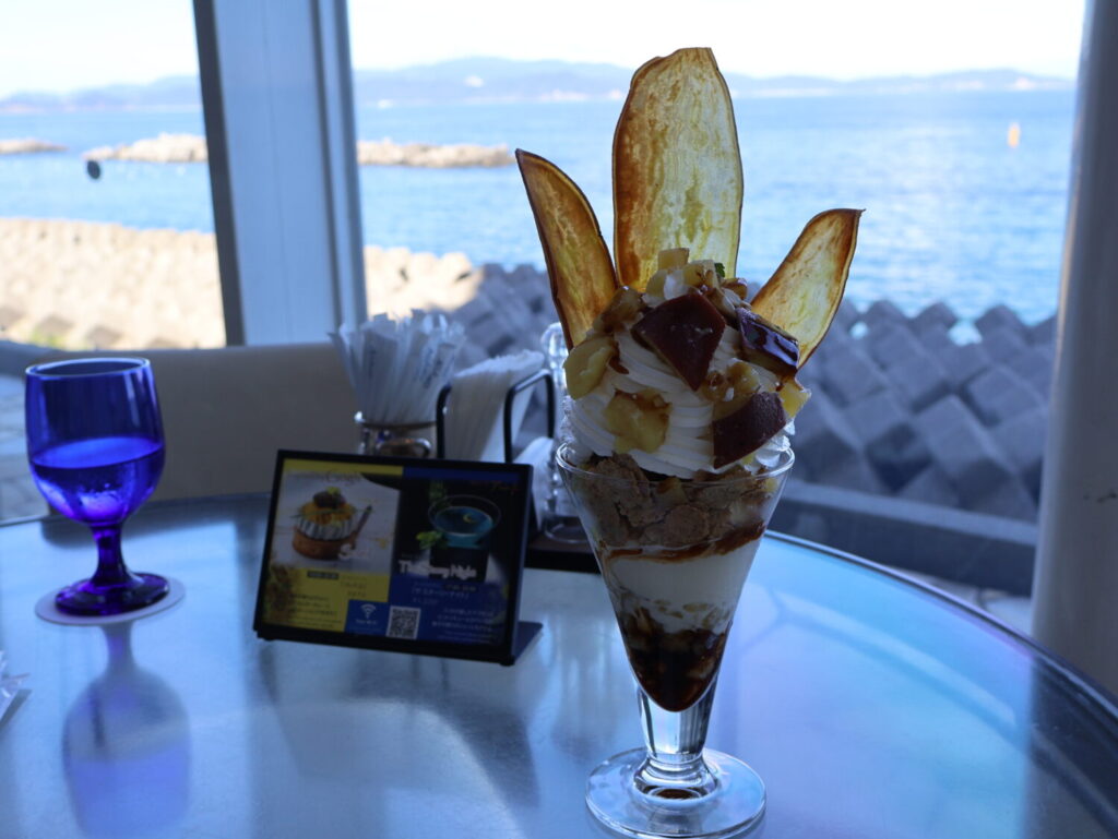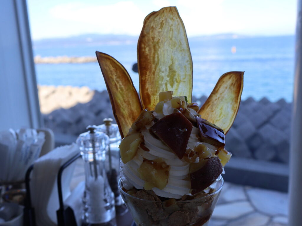 鳴門金時を贅沢に使ったこのパフェですが、お値段は¥1350とお手頃です(2025年10月現在)。ちなみに、パフェに使う鳴門金時は全て鳴門市内で仕入れているそう。