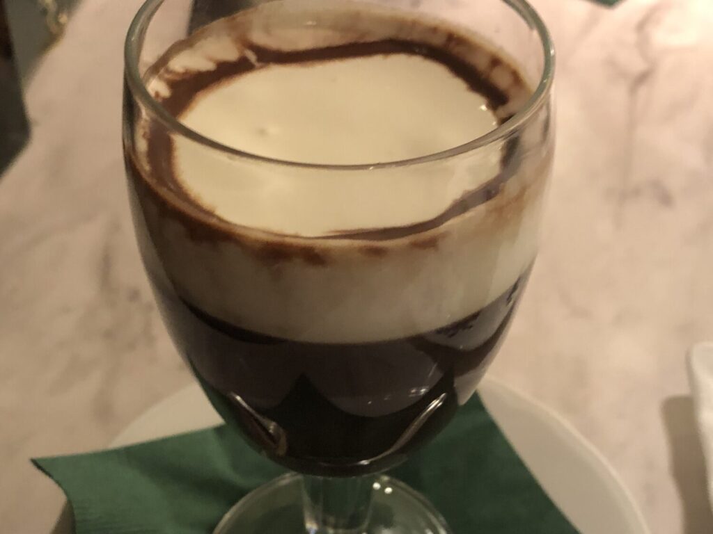 「Bicerin(ビチェリン)」というお店はもともとトリノで1763年からある老舗カフェで、巡礼者の滋養強壮ドリンクとして「ビチェリン」が作られていたそう。グラスの中は下からチョコレート、コーヒー、ミルクと層になっていて、エスプレッソの苦みをチョコレートの甘さが打ち消すようになっています。当時はこれが滋養強壮ドリンクだったのですね。