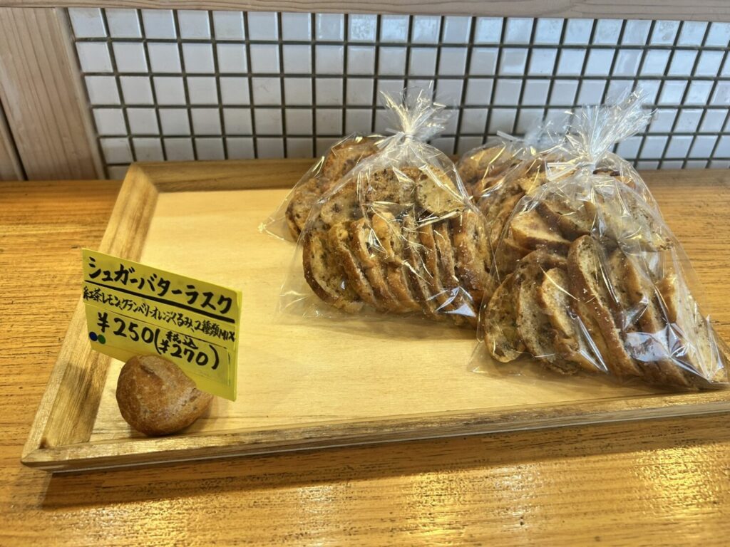 お客様が「前に来た時に買ったラスク、前よりおいしくなってて!また買いにきたよ!」と言うと、「そうなんです、実は2種類の違うラスクを入れて、食感を楽しめるようにしました」と奥さん。