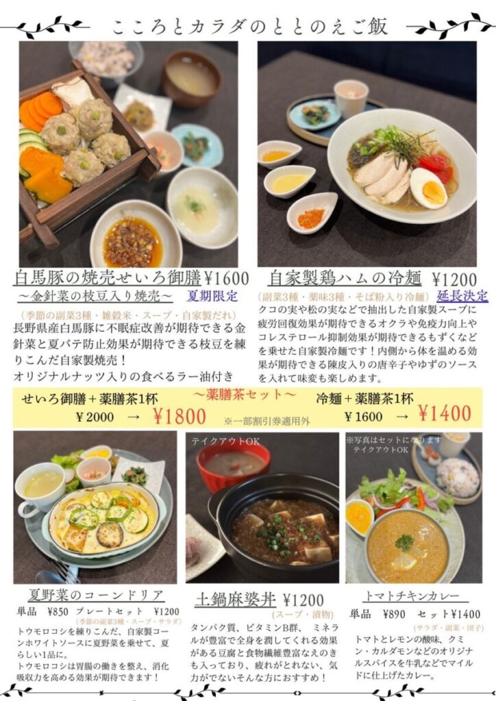 白馬豚の焼売せいろ御膳 ~金針菜の枝豆入り焼売~ | 1600円 | 1800円 |