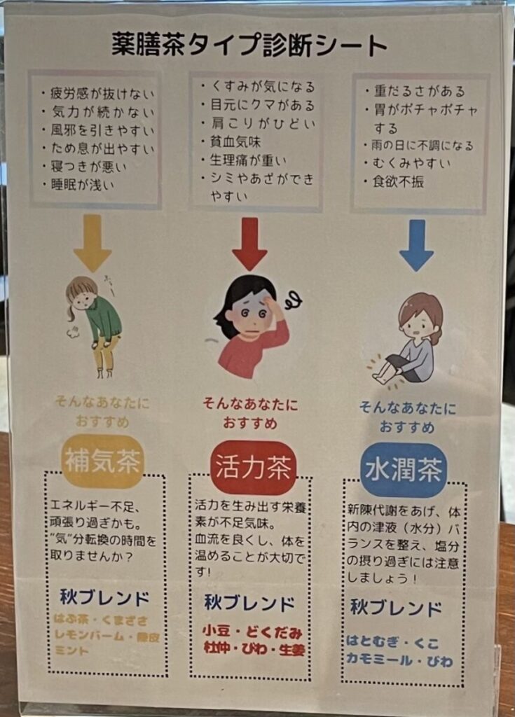店内には「薬膳茶タイプ診断シート」があり、今の自分の心や体の状態に合った薬膳茶がどれかが分かります。