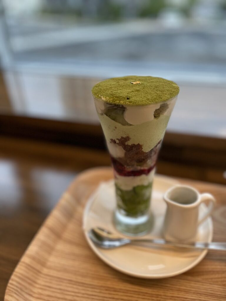 抹茶パウダーと添えられた金箔が上品なパフェです。