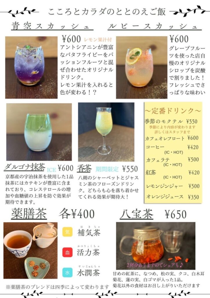 今回は「くすみが気になる」「目元にクマがある」といった人におすすめされていた「活力茶」400円(税込)を注文します。