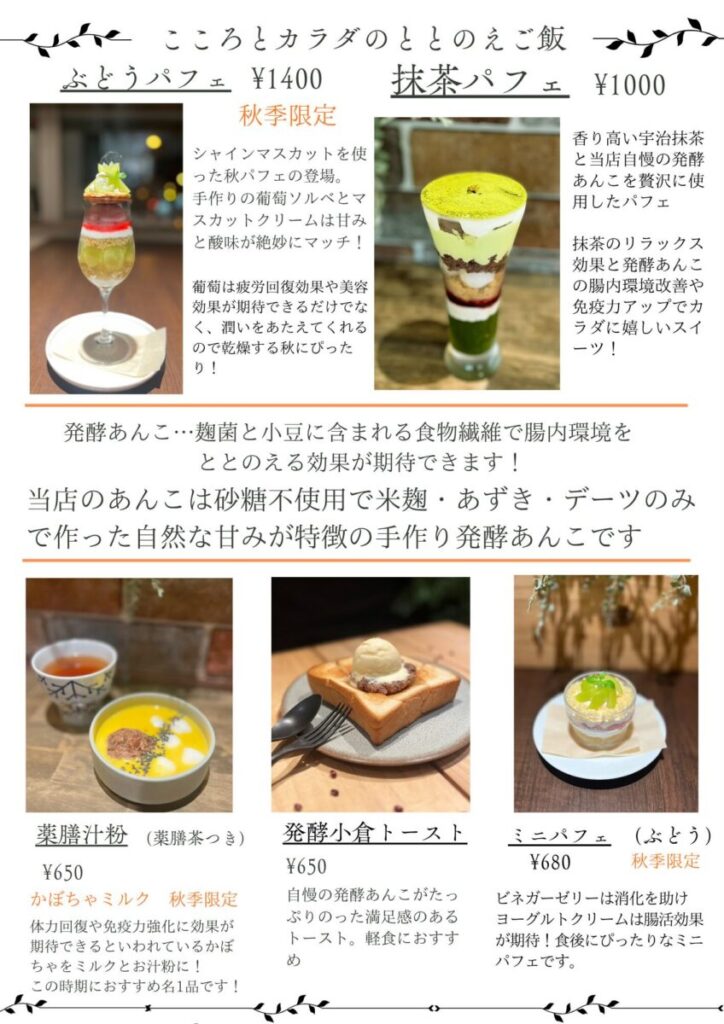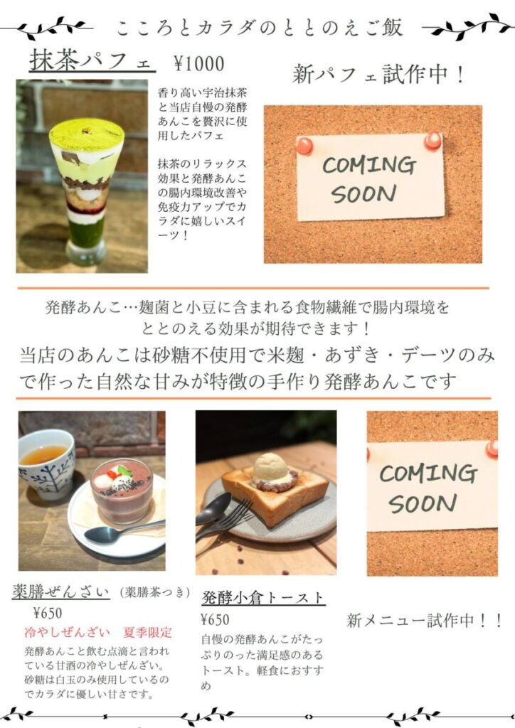 いずれのメニューも、米麹・あずき・デーツのみから作られた自然な甘みが特徴の「発酵あんこ」が使われています。