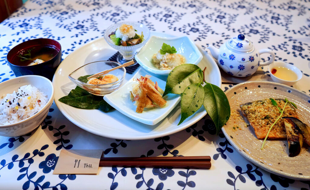 丁寧に盛り付けてある食事と、さまざまな形の陶器のうつわは目も楽しませてくれます。