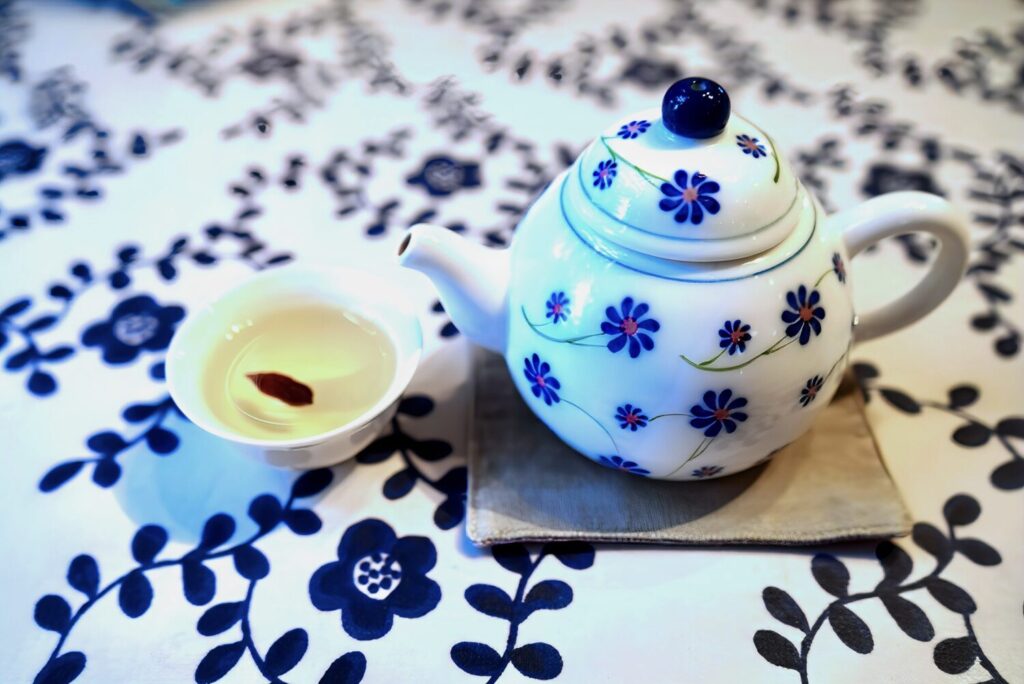 お食事が並ぶ前に、まず届くのが薬膳茶。かわいらしい湯呑みに赤いクコの実が添えてあり、ティーポットから注ぎ入れます。薬膳茶はおかわり自由なので食事中ずっと楽しむことができます。