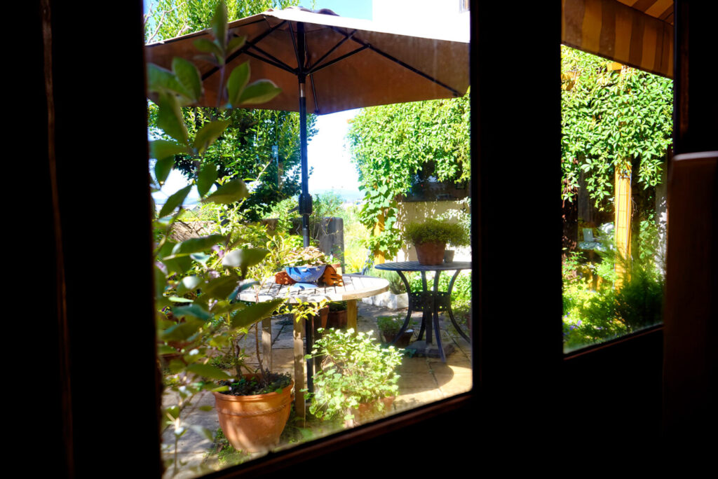 レンガ作りの建物と窓から眺める庭の景色は、温かい心地よさに包まれています。