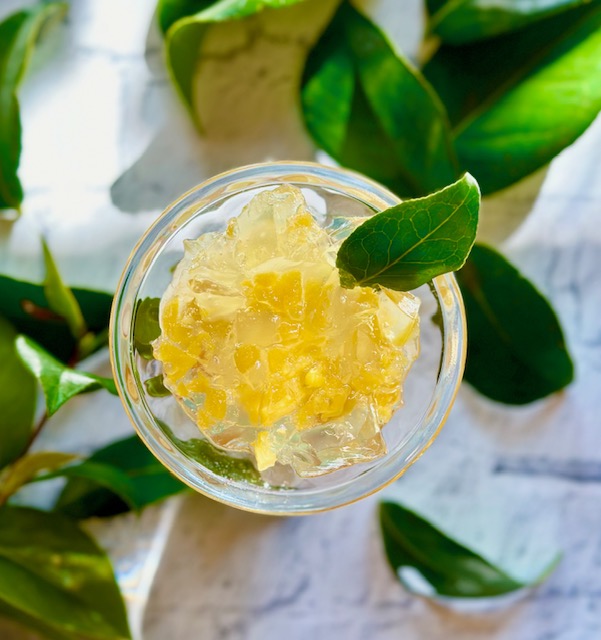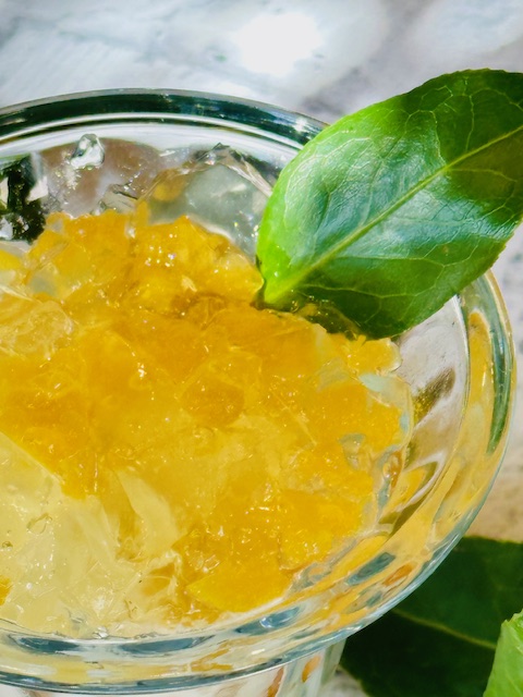 中のフルーツも秋ならではのみかんや、柿をラム酒でマリネしたものなどを入れてあり、透明のゼリーに包まれたパフェです。