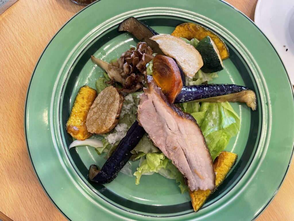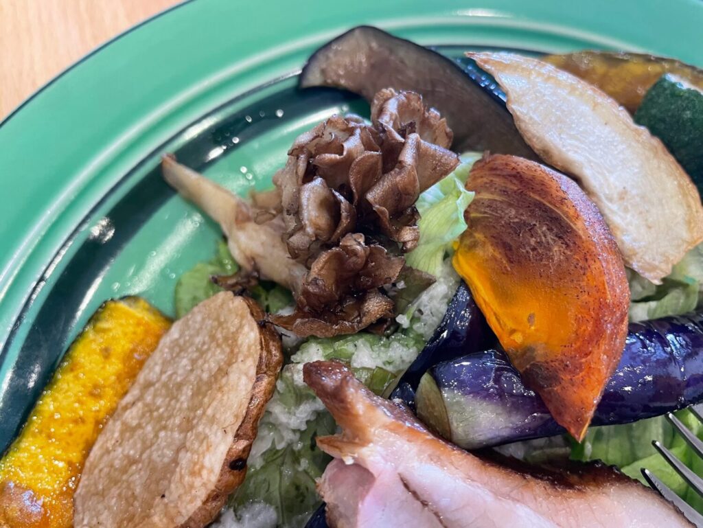 葉物の上に添えられた野菜の数々。来店当時は、舞茸にかぼちゃに、ズッキーニに…、なんと、柿まで!