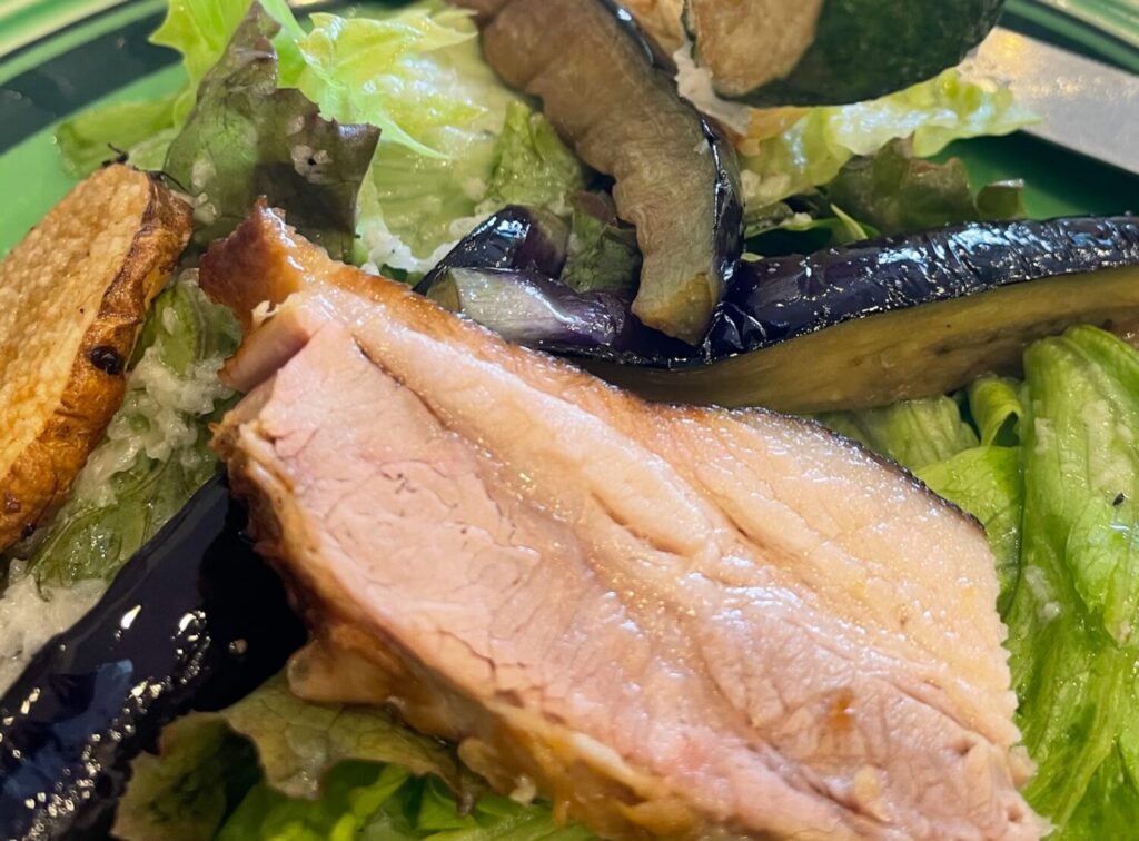 厚みのあるぬか漬けベーコンが一枚。サラダの上にのっています。