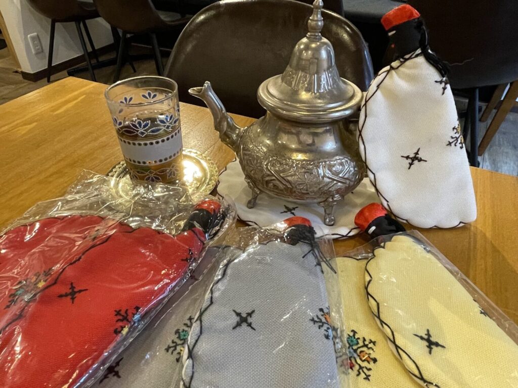 ミントティーをいただく時に使用されたティーカバーも、モロッコ雑貨です。