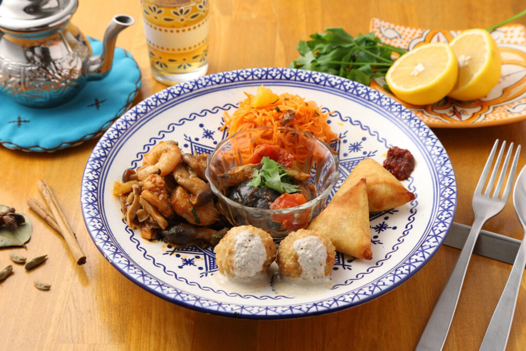 料理に使用する皿もモロッコ製。色鮮やかな色合いと模様に心躍ります。料理だけでなくテーブルウエアからもモロッコを感じることができます。