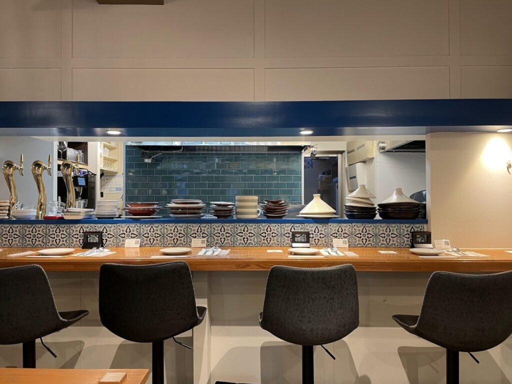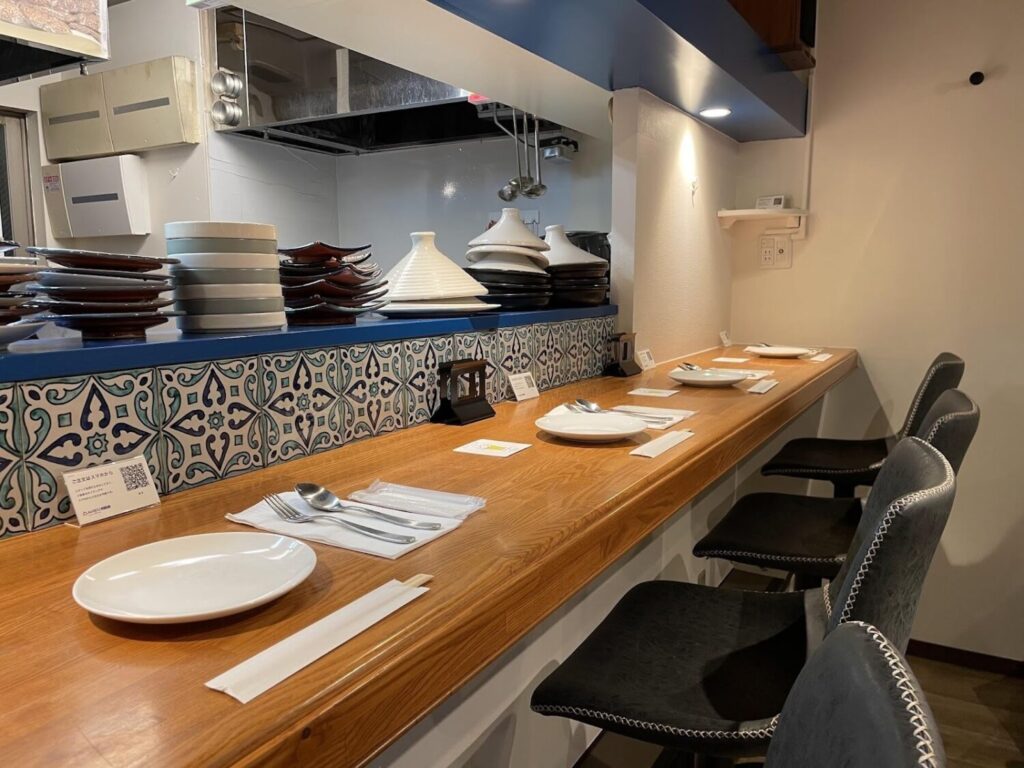 カウンター上には、料理で使用するモロッコ製のタジン鍋や皿が並びます。料理を待つ間にもモロッコの雰囲気を存分に味わえるのです。