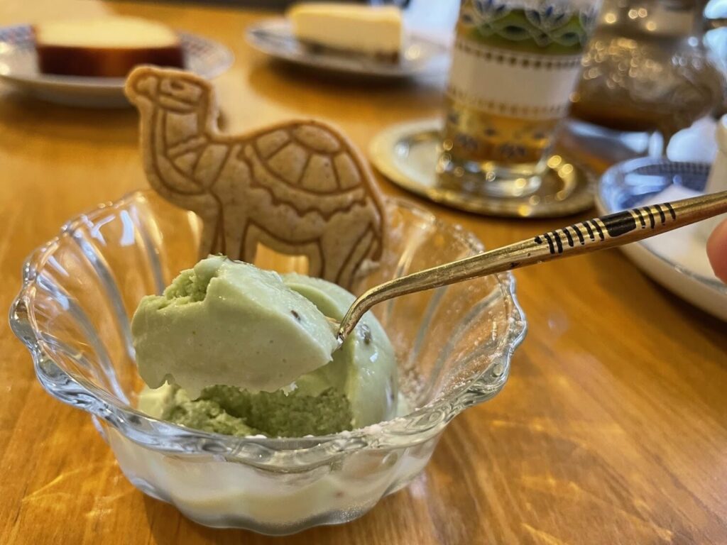 ピスタチオの風味満点のアイスと、スパイスの効いたラクダのクッキーに思わずにっこり。