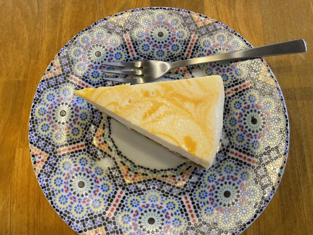 ハリッサチーズケーキは、自家製のハリッサ(モロッコの唐辛子ペースト)を使用した、他ではなかなか味わうことができないチーズケーキです。上部のマーブル模様にハリッサが使用されています。