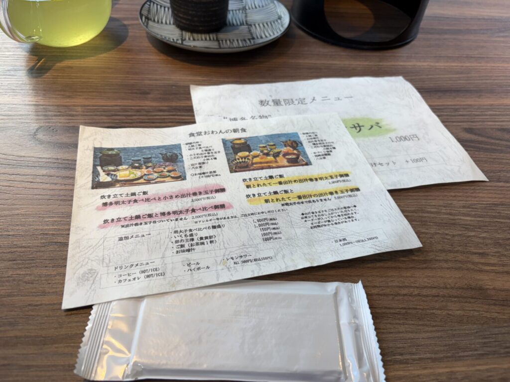 今回は、「博多明太子食べ比べと小さめ出汁巻き玉子御膳(税込2,500円)」を味わってきました。