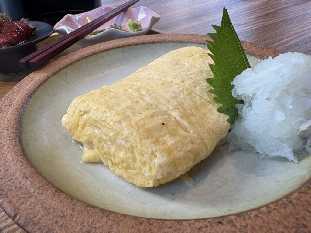 焼き立ての出汁巻き玉子の表面はほんのりと色づき、箸を入れると出汁がじんわりと広がります。味付けは控えめで、卵の旨みと出汁の香りが調和した上品な味わい。