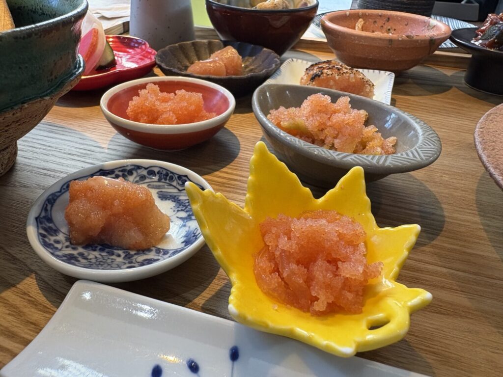 博多明太子食べ比べと小さめ出汁巻き玉子御膳で最初に目を引くのは、ずらりと並ぶ6種類の明太子。定番の辛子明太子をはじめ、炙り明太子、数の子入り、くらげ入り、いか明太子、白菜明太子と、それぞれ風味も食感も異なります。