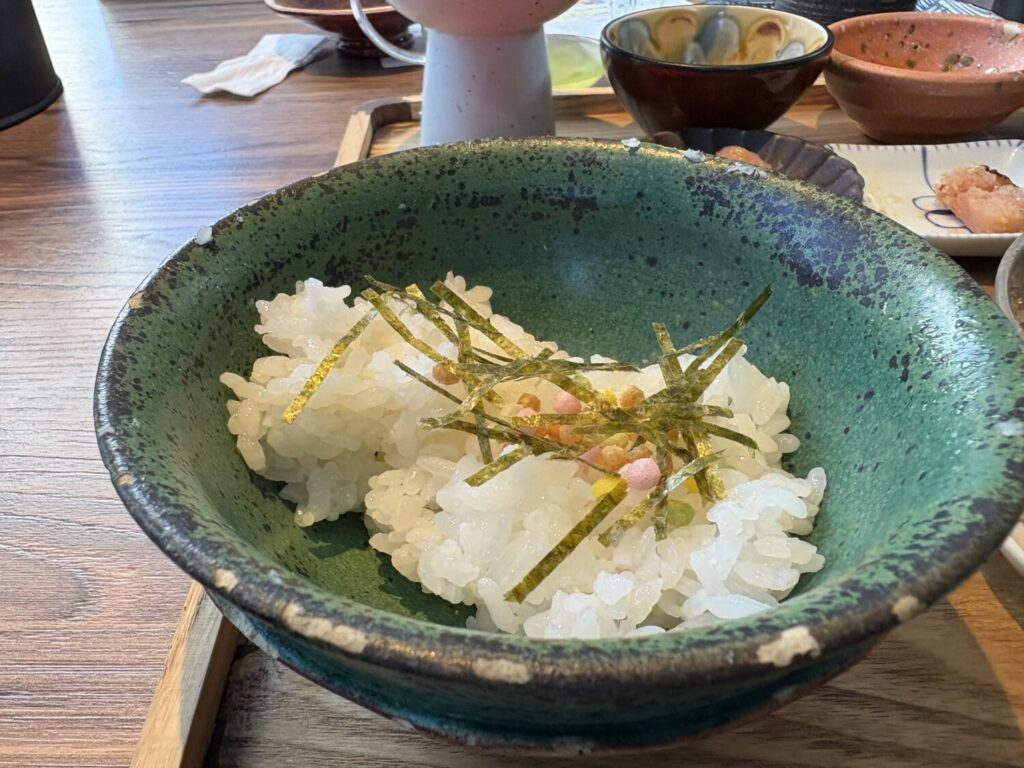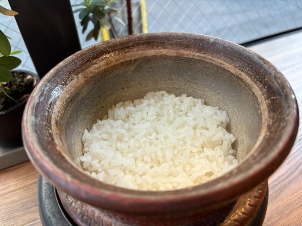 一人ひとりに土鍋を用意し、炊きたてをそのまま提供。ふたを開けた瞬間、立ちのぼる湯気と甘い香りが広がり、つややかに輝く白米が顔をのぞかせます。まずはお米だけで味わい、その後に塩やおかずと合わせるのがおすすめ。シンプルながらもお米本来の旨みを堪能できるよう、細部まで計算された一杯です。