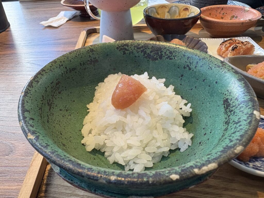 小ぶりのお茶碗に3杯分ほどの量で、もちもちとした食感と自然な甘みが特徴。どの明太子ともよく合い、最後はお出汁をかけてだし茶漬けとして締めると、また違ったおいしさを楽しめます。