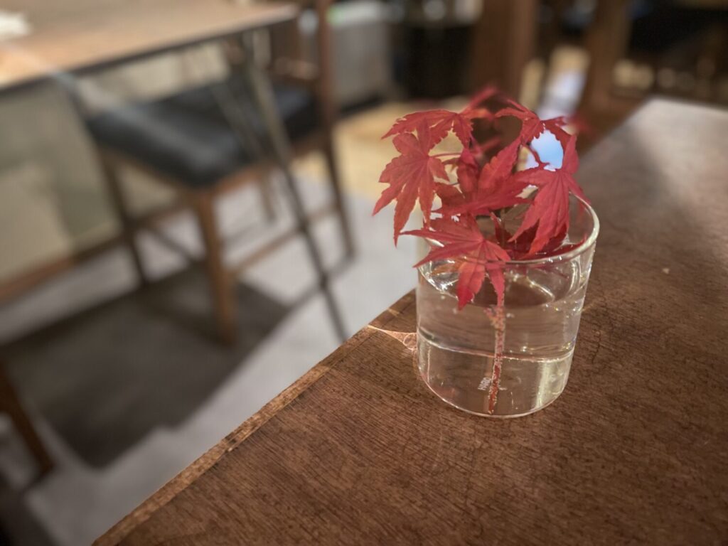 机上に飾られている紅葉した枝葉も、シックな雰囲気を漂わせています。