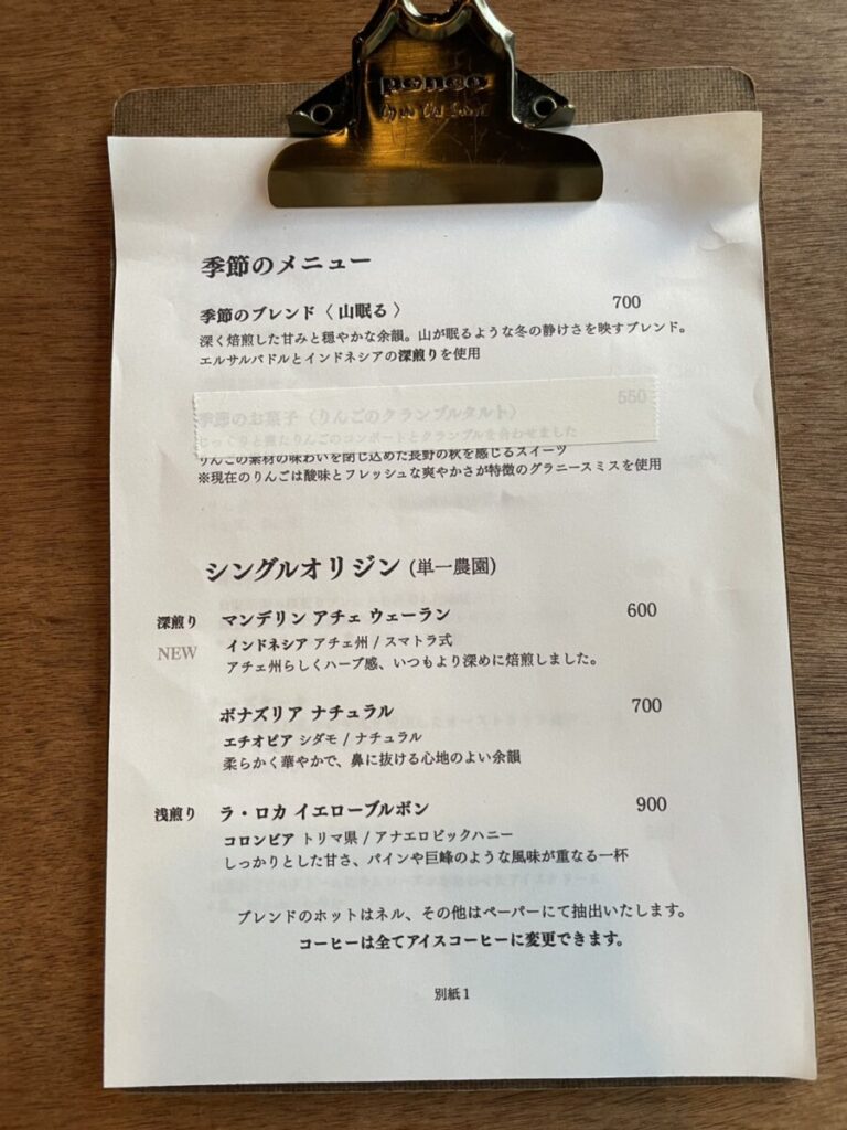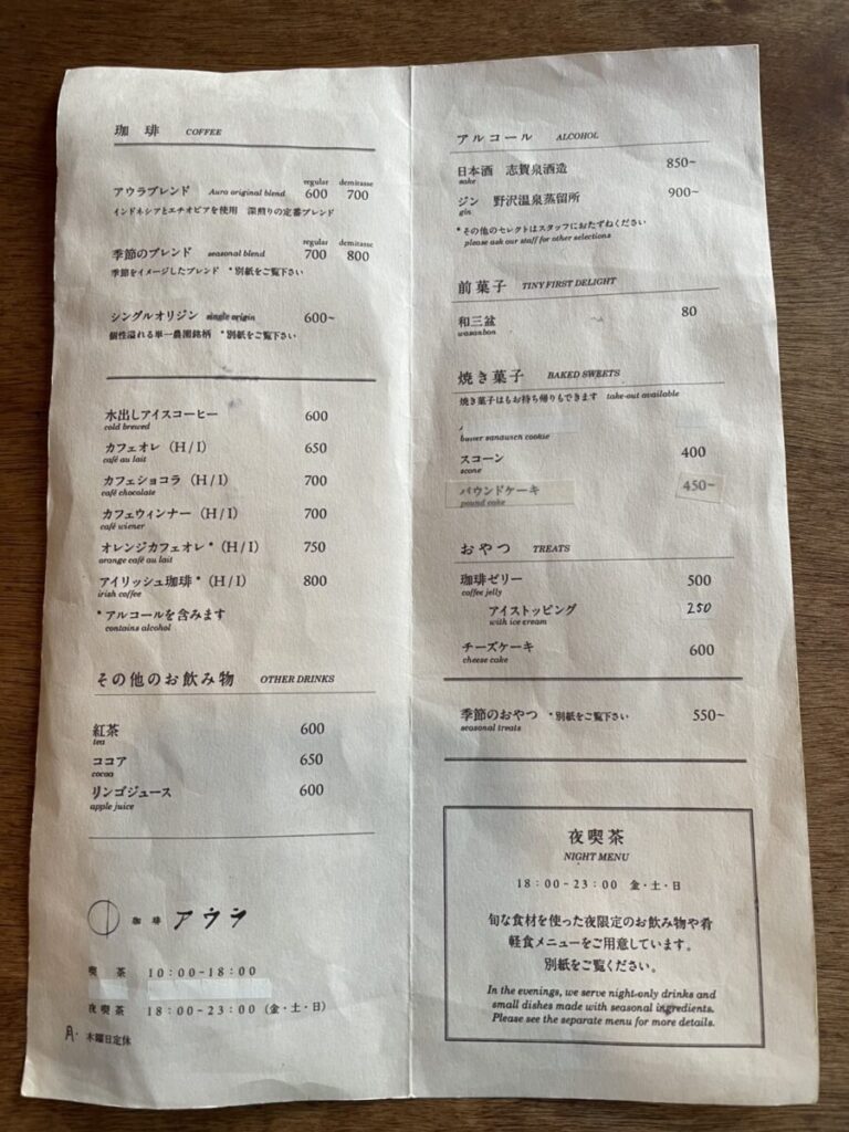 席に置いてあるのは、「珈琲アウラ」と書かれた紙のメニュー。