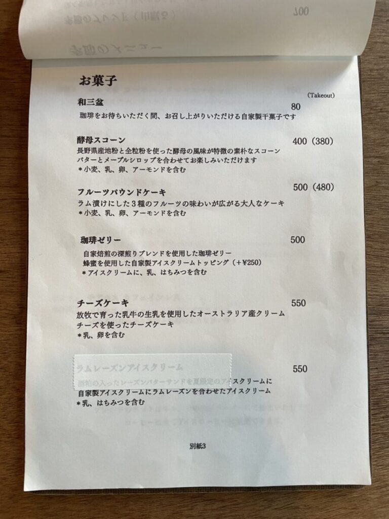 前菓子・焼き菓子といったお菓子のメニューもあり、コーヒーや紅茶にとても合いそうです。