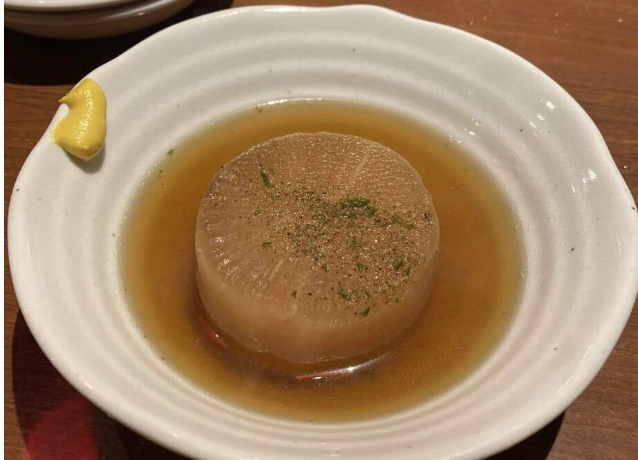 特におすすめなのが「大根」。箸を入れるとスッと切れ、じゅわっと出汁が染み出すその瞬間は、まさに至福。口に入れた瞬間、ほろりと崩れ、出汁の旨みと大根の甘みが一体となって広がります。