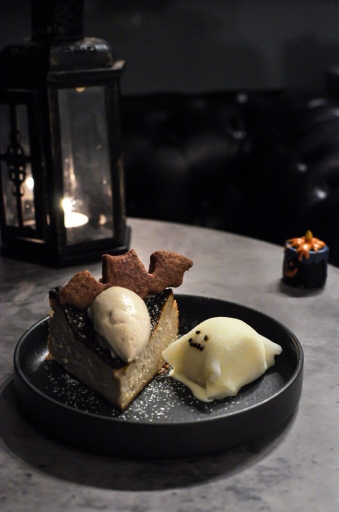 栗のバスクチーズケーキに紫芋のクッキーがのった秋らしいケーキと、ぎゅうひで包んだおばけが添えられたハロウィンにぴったりのスイーツ。