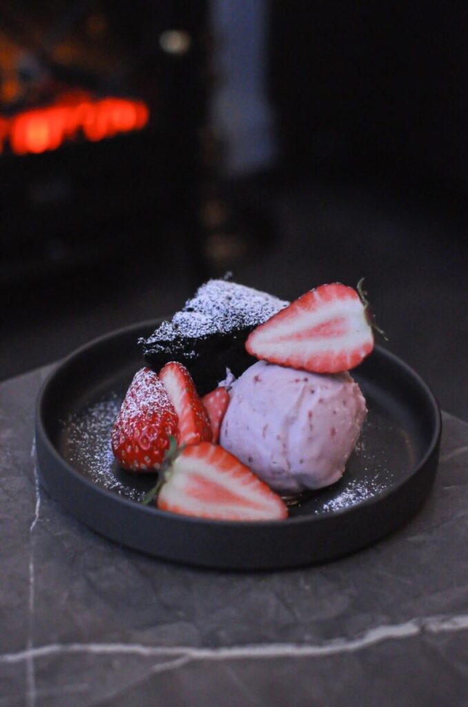 チョコレートとブラックココアパウダーを使用した濃厚なガトーショコラに、いちごといちごアイスを添えた一品。